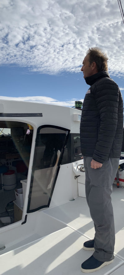 « Mon catamaran (TS 52) n’est pas fait pour affronter une mer dantesque et des vents de plus de 50 nœuds. La limite pour ce genre de bateau c’est 4 m de creux. J’ai préféré protéger le bonhomme et le bateau, c’est le bon sens marin. » explique Bertrand de Broc amarré au ponton de Bénodet à côté de deux autres concurrents de la classe Rhum Multi : Christian Guyader et Christophe Bogrand. Le début de course de la 11e édition de la Route du Rhum-Destination Guadeloupe est on ne plus rude pour les 123 équipages partis dimanche dernier de Saint-Malo. Près d’un tiers de la flotte s’est arrêtée pour cause d’avarie ou de mise à l’abri, secoué par un front dépressionnaire casse-bateau. Bertrand met aujourd’hui à profit ce temps d’attente pour réparer son pilote automatique et les petits bobos du bord.