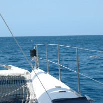 Le grand catamaran, un « Tahiti 75 » du chantier Fountaine-Pajot, ne pouvant accoster le long de l’unique et principal ponton de la ville, c’est en annexe que le transbordement eut lieu.