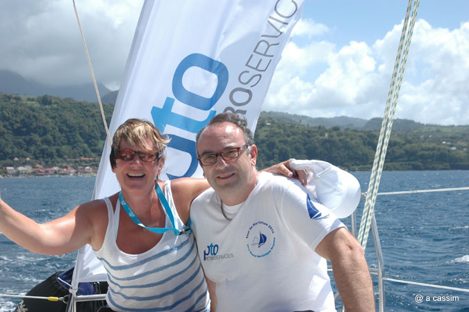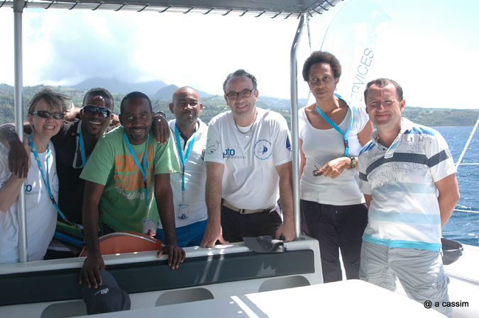 De notre côté nous avions quitté, dans la matinée, le Club Nautique du Lamentin (point de bouclage de la course), situé sur la côte ouest de l’Ile, et nous attendions, avec une certaine impatience, cet immense catamaran affrété par le sponsor de l’évènement « Pétroservices » …et à bord duquel nous aurons le plaisir de suivre les derniers milles de la deuxième étape.