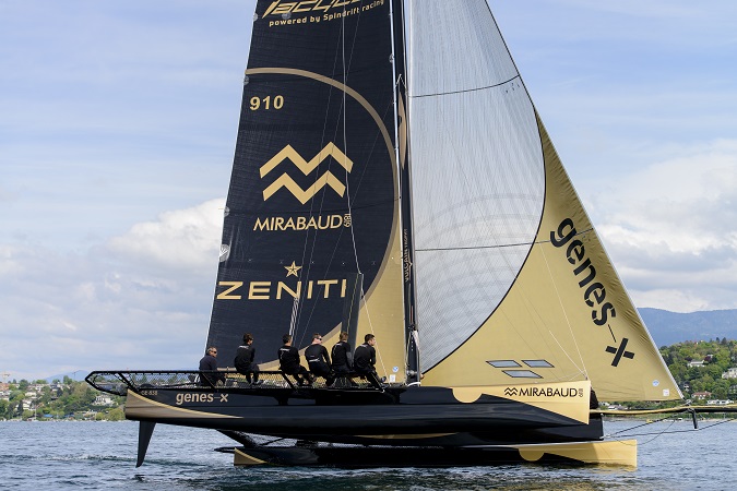 Ladycat powered by Spindrift racing Decision 35 catamaran trainings on the Geneva Lake before the start of the 2014 Vulcain Trophy season. (Photo © Chris Schmid / Spindrift racing