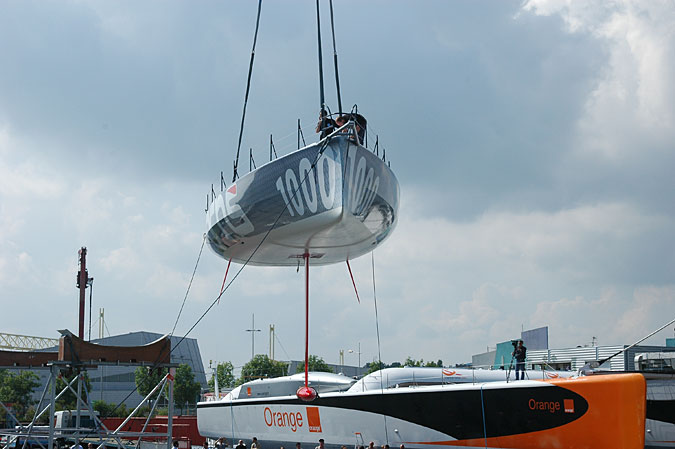 Mise à l'eau aux chantiers Multiplast à Vannes du 60 pieds DCNS - au second plan le catamaran Orange II