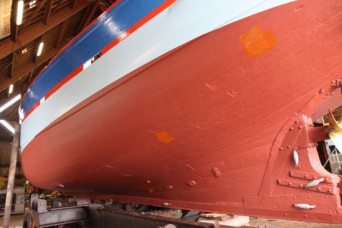 Après 10 mois de travaux, la Gabare André-Yvette est sortie des chantiers navals Bernard à Saint-Vaast La Hougue, le 5 août 2011, pour retrouver son élément naturel : la mer.