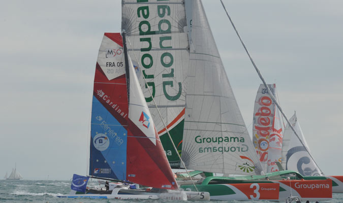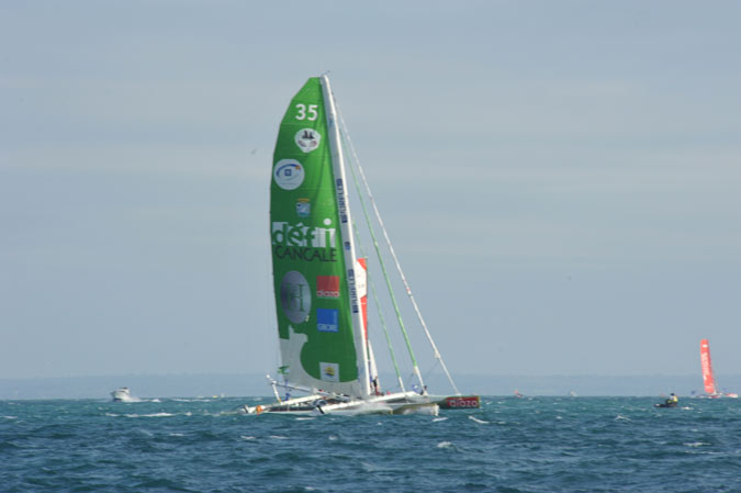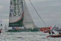 Après un run impressionnant, Groupama, mené par son skipper Franck Cammas, a viré le premier la bouée de dégagement toute proche de la côte au Cap Fréhel sous les yeux admiratifs de milliers de spectateurs.