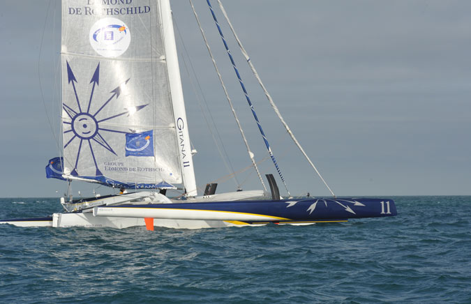 Son trimaran qui est l’ex Côtes d’Or d’Eric Tabarly sera remorqué jusqu’à Lorient.