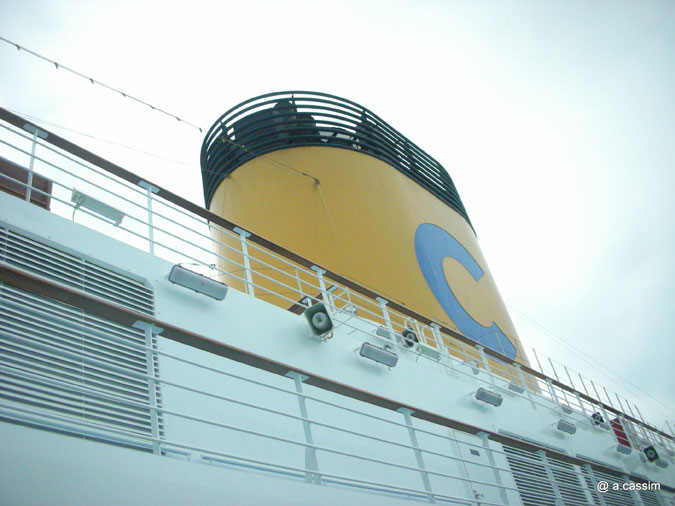 Le géant des mers avec sa grosse cheminée jaune, marque de Costa Crocière, est couché misérablement devant le petit port de Grosseto et menace d’un lourde marée noire cette côte Toscane.