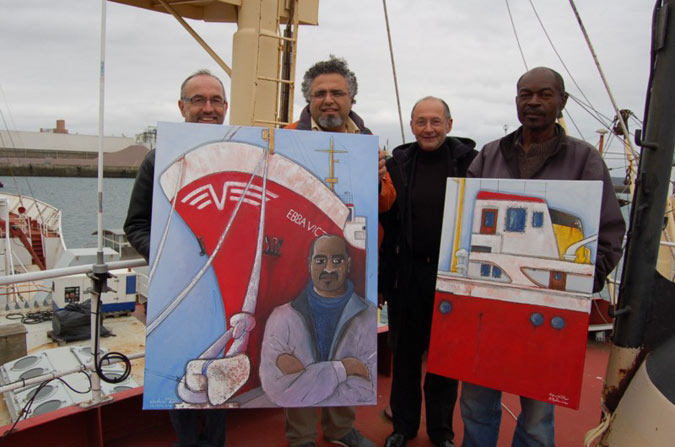 Après une visite à bord en compagnie de Jean-Paul Hellequin, président de l’association Mor Glaz, l’artiste Râmine, basé à Brest, décide de mettre ses talents au service de cette noble cause. « Notre but c’est de faire en sorte que le marin et chef mécanicien Claude Foko puisse retourner chez lui. La solidarité des gens de mer permettra de l’acheminer jusqu’à son pays. Mor Glaz fait également pression pour que les arriérés de salaires soient payés par le propriétaire.