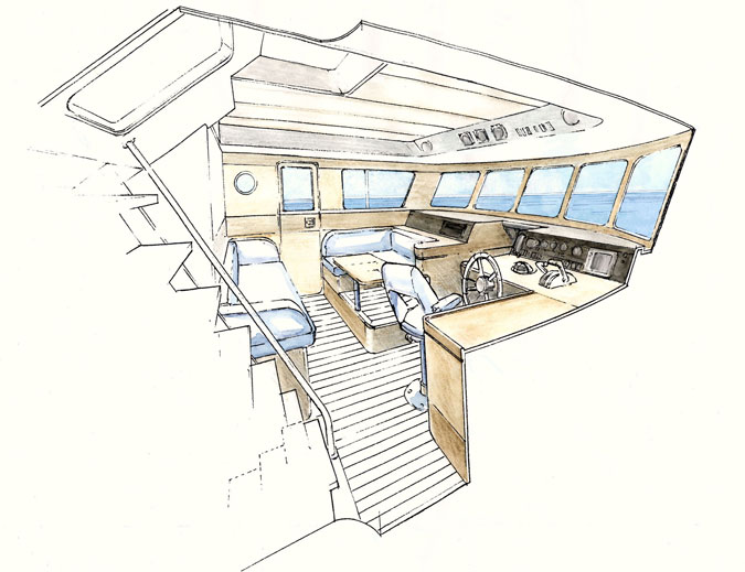 La timonerie peut aussi être placée au dessus de la salle des machines, permettant d’abaisser le centre de gravité et de réduire le franc-bord : ce qui lui confère une plus grande élégance de ligne et une meilleure stabilité.